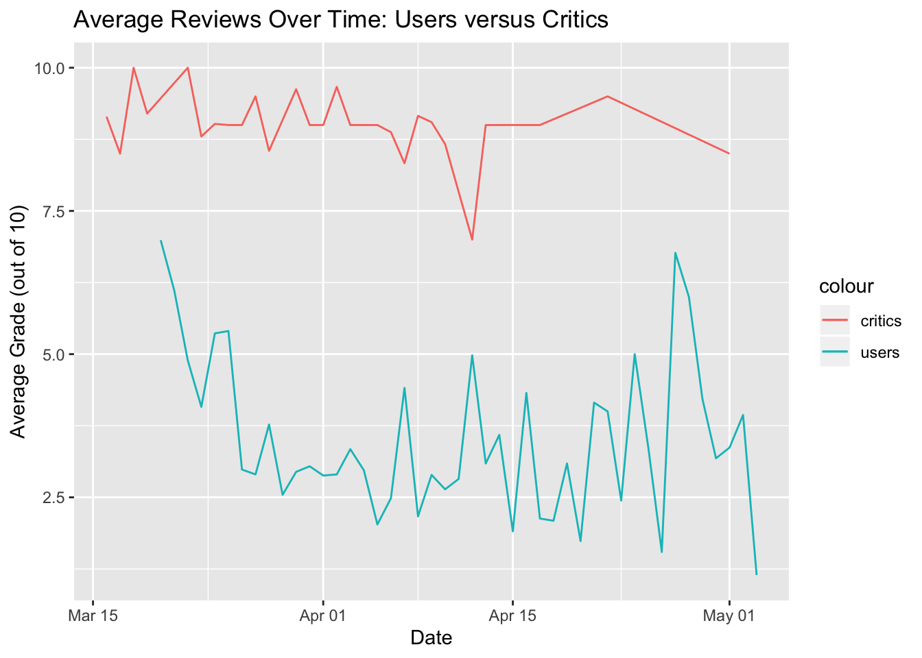 In order to see the overall trends in the reviews of critics versus users, I created a time series plot showing the trends over time in the average numerical ratings by critics and users (out of 10) since the game was released. The critics originally gave scores out of 100, but I converted them to be out of 10 for more consistent comparison to user reviews, which were out of 10.