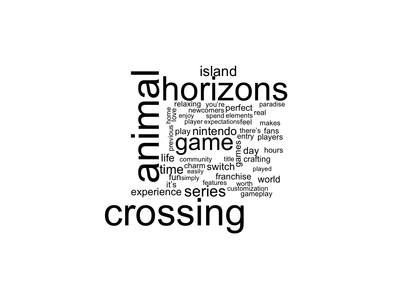 Overall, it still puzzles me why the critics and the users would have such drastically different opinions on the same game, but it is clear based on both the quantitative analysis of the scores and the qualitative analysis of the text reviews that critics expressed much higher levels of satisfaction than did users about Nintendo’s new release Animal Crossing New Horizons. I will have to do more research on the game and on the process of video game review to better explain these results.