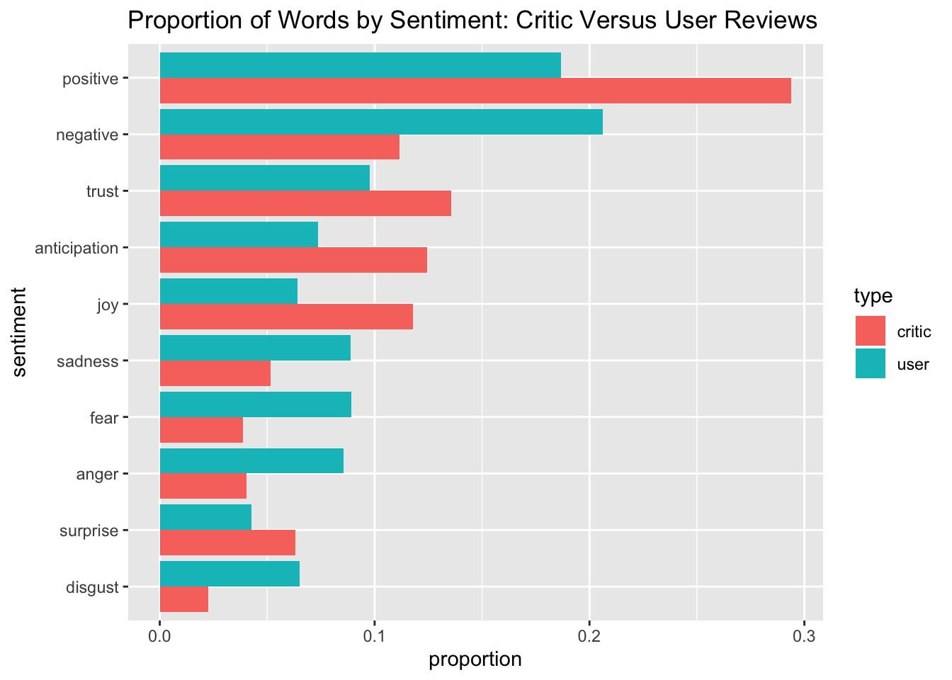 In order to dig deeper into the differences in sentiments being expressed in critic versus user reviews, I used the nrc data set from the textdata package7, which is a crowd-sourced data set that classifies almost every word in the english language based on 10 sentiments: positive, negative, trust, anticipation, joy, sadness, fear, anger, surprise, and disgust. I joined this dataset with the data sets containing the words from the user and critic reviews in order to classify each word in the reviews based on these sentiments. Then, I computed the proportion of words associated with each sentiment for critic and user reviews, and compared the proportions using the bar plot below.