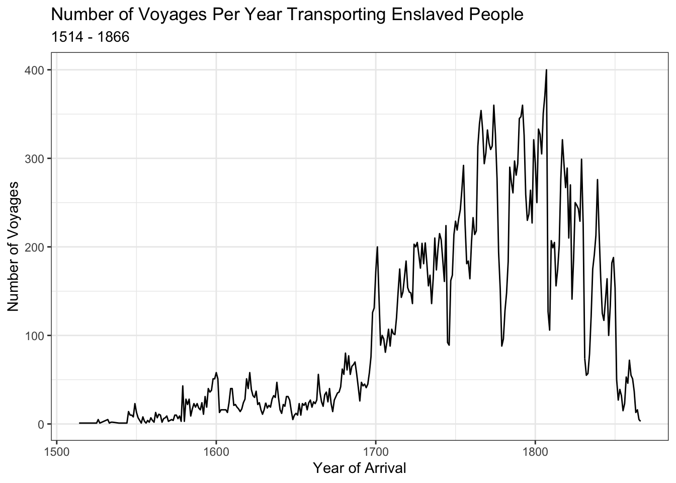 In order to give a broad overview, I have created a time series plot below showing the trends in the number of voyages transporting enslaved individuals per year between 1514 and 1866. We can see that the numbers steadily increase starting in 1514 at the beginning of the era of colonization and peak and then start to decline around 1808 when the slave trade was made illegal in the U.S. In total, 36,110 voyages were recorded in this data set.