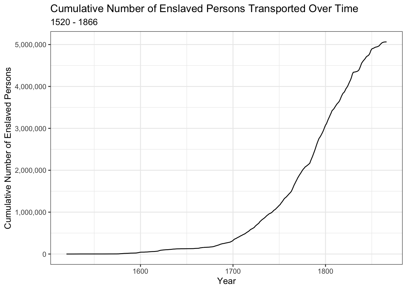In order to emphasize the sheer number of individuals affected by the slave trade, I have created a plot below showing the cumulative number of individuals transported and forced into slavery over this time period. As the graph makes clear, over 5,000,000 individuals had been transported on slave ships by 1866. Furthermore, of the 36,110 voyages recorded, 17,746 of them have missing values for the number of individuals on the ship, so these observations are not included in the plot below. Therefore, there are likely many more individuals, possibly millions, who are not represented. We must also remember that the institution of slavery affected far more individuals than just those who were physically taken from their homes and enslaved– it also affected generations of individuals born into slavery as well as those who still face discrimination today as a result of this institution that formally ended over 100 years ago.