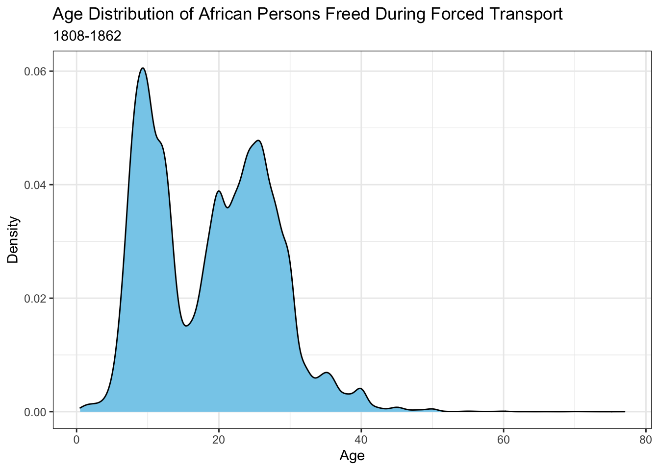 The density plot below analyzes the age distribution of these freed individuals in more detail. Surprisingly, it appears that there was a large proportion of young children (around age 10-15) on these intercepted ships, and less surprisingly, a similarly large proportion of individuals in their 20s and 30s.