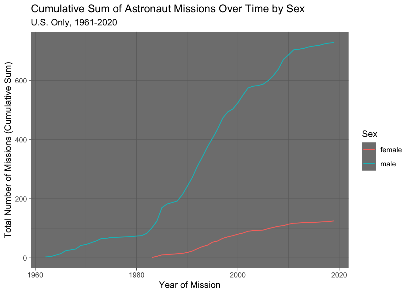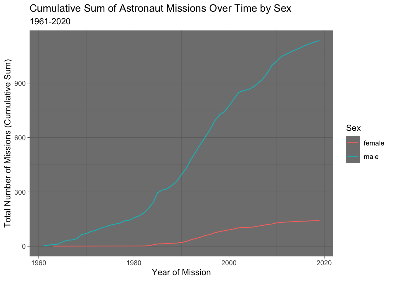 I start with an overview using time series plots to show the cumulative number of missions and hours of space travel since 1961 by sex. I then delve deeper into the demographics of the astronauts by exploring age distributions, sex, and the relationship between the age of an astronaut’s first mission and how many total missions they complete. The data represents worldwide space travel, but for certain specified analyses I extract only astronauts from the U.S.