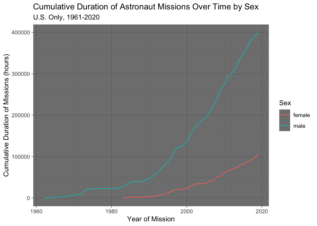 In order to visualize the overall trends in space travel by sex over time, I have created two time series plots below representing the total number of missions (first plot) and the total number of hours spent in space travel (second plot) since 1961. By the beginning of 2020, there had been 1,277 space missions (1,134 by men and 143 by women) adding up to a total of 1,341,979 hours of (recorded) space travel worldwide! That’s over 153 years (counting missions running at the same time each separately)! Clearly, however, women are extremely underrepresented in this field. Even in 2019, there remains an enormous gap between the number of missions completed by female astronauts and the number completed by males.