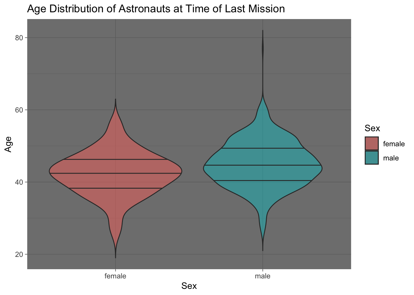 To visualize the age distributions of astronauts, I have created two violin plots below showing the age distributions by sex for astronauts embarking on their first space travel mission (first plot) and their last space travel mission (second plot). The lines represent the first, second (median) and third quartiles.