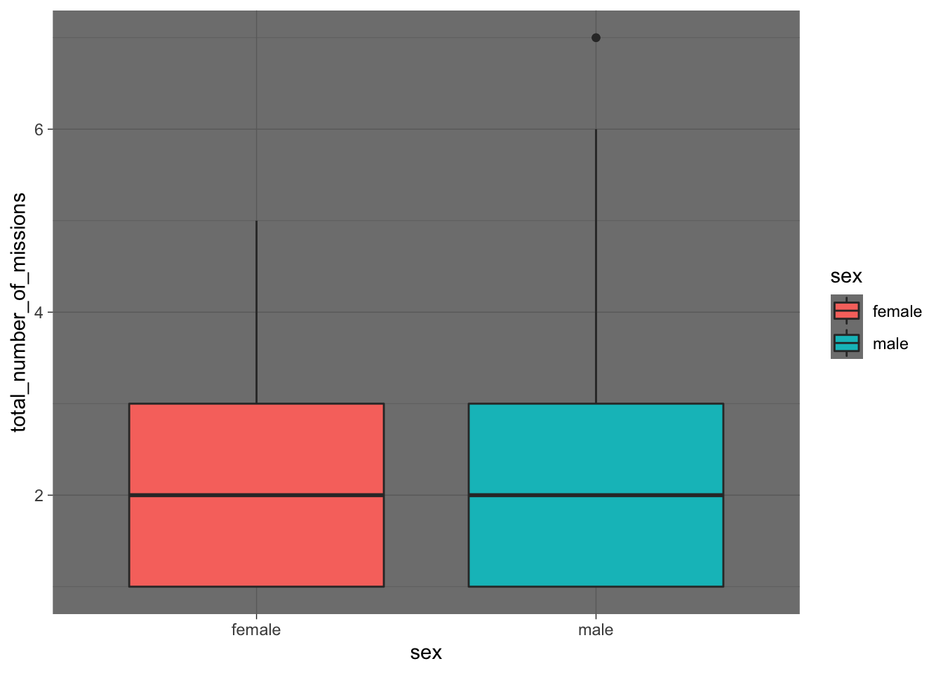 The boxplot below visualizes the distributions of number of space missions completed (per astronaut) by sex. Surprisingly, the median number of missions seems to be around 2 for both males and females. I would have predicted that the number of missions per astronaut would have been significantly higher for males based on the previous patterns.