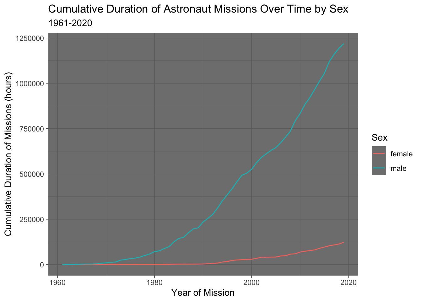 In order to visualize the overall trends in space travel by sex over time, I have created two time series plots below representing the total number of missions (first plot) and the total number of hours spent in space travel (second plot) since 1961. By the beginning of 2020, there had been 1,277 space missions (1,134 by men and 143 by women) adding up to a total of 1,341,979 hours of (recorded) space travel worldwide! That’s over 153 years (counting missions running at the same time each separately)! Clearly, however, women are extremely underrepresented in this field. Even in 2019, there remains an enormous gap between the number of missions completed by female astronauts and the number completed by males.